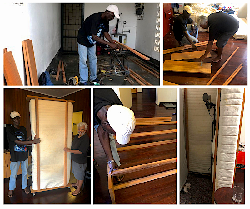 Omdat de kosten daarvan best hoog zijn, besloot ik zelf iets te gaan bouwen. Helaas bleek dat geen goedkopere oplossing, omdat materialen hier in Suriname niet voorhanden zijn. Zo ontstond een volgende idee om in de hoek van een wat kleinere kamer op te gaan nemen en die hoek af te schermen met oude matrassen. Het werd een doe-het-zelf-project, waarbij ik samen met cameraman Sean onze 20 jaar oude matrassen in een soort stellage plaatste. De oude matrassen waren te slecht geworden om nog op te slapen, maar hopelijk goed genoeg als geluiddempers.